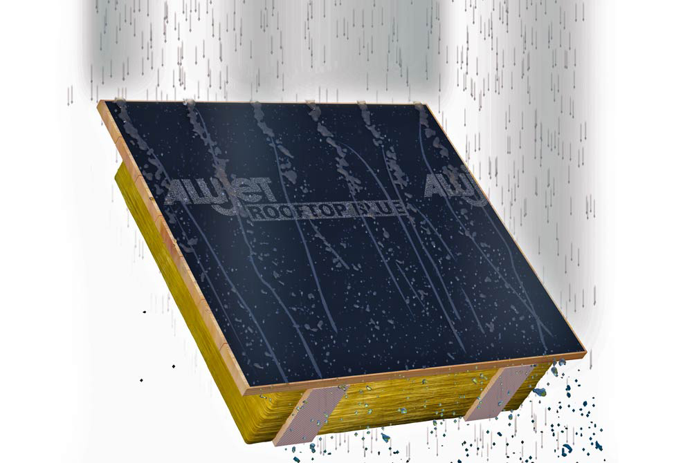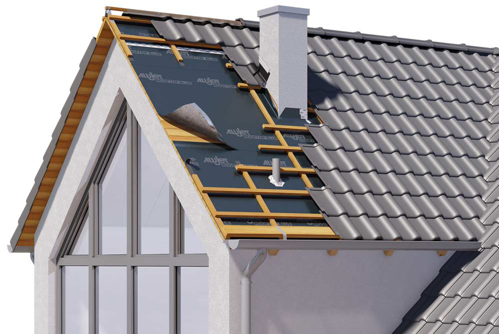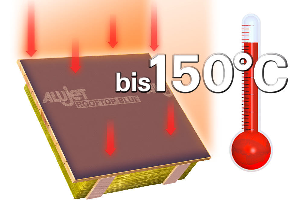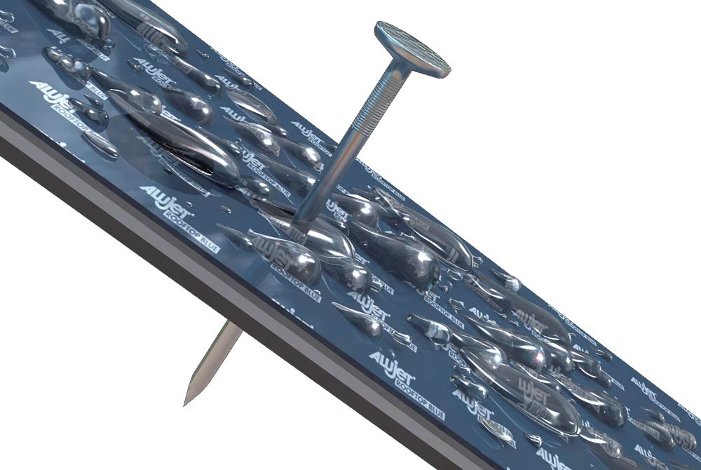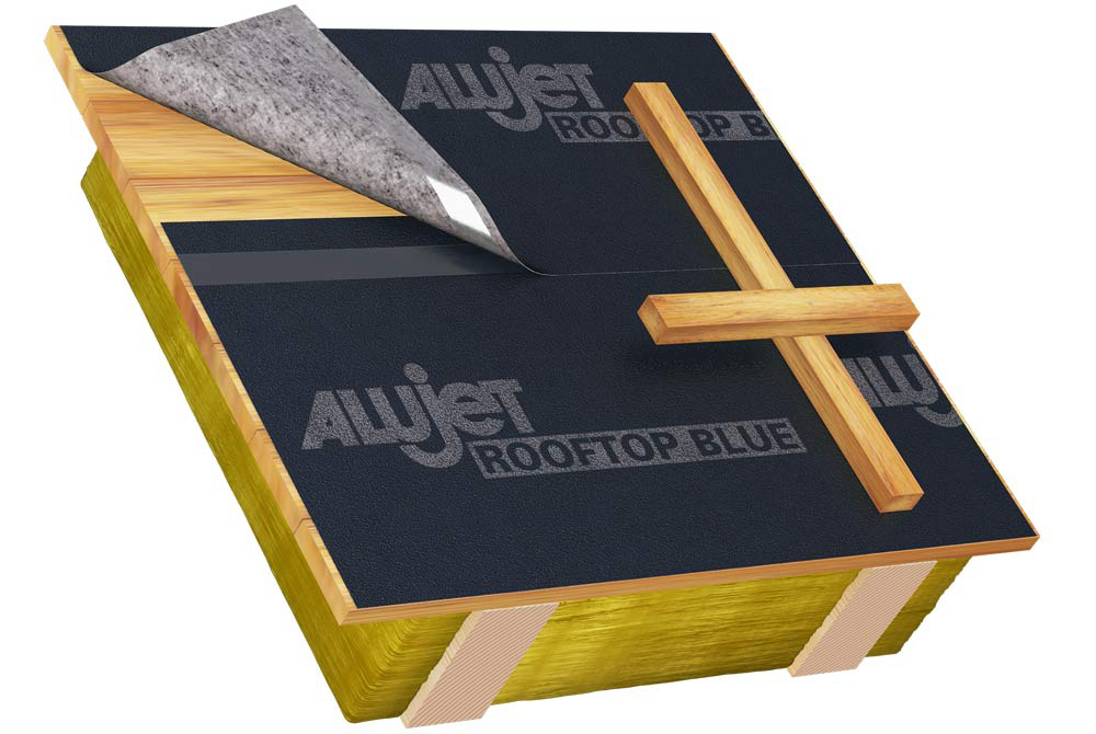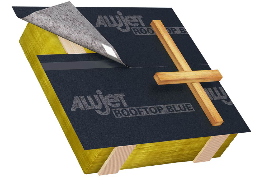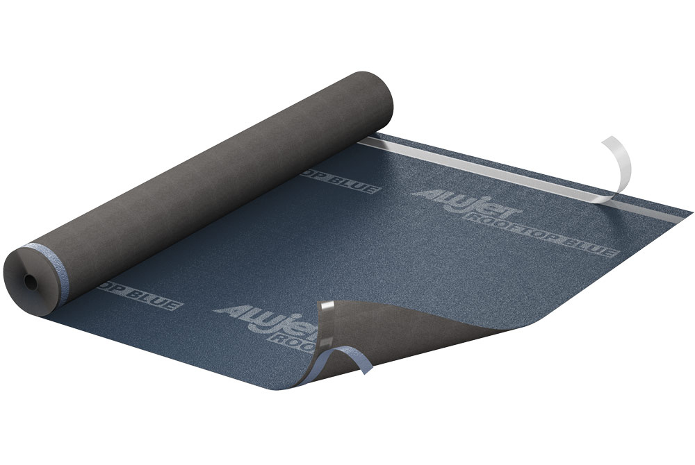 Die ALUJET Rooftop BLUE, aus einem mehrfach beschichteten PES-Vlies, ist eine Unterdeck- und Schalungsbahn mit integrierter Nageldichtung.
