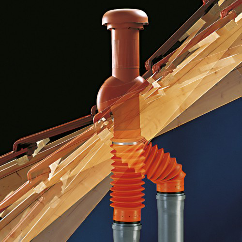Venduct® Anschlussschläuche stellen eine flexible Verbindung zwischen Rohrleitung und Dachdurchgang her, überbrücken Längendifferenzen und gleichen Achsversätze von maximal 45° Neigung bis zur Lotrechten aus.