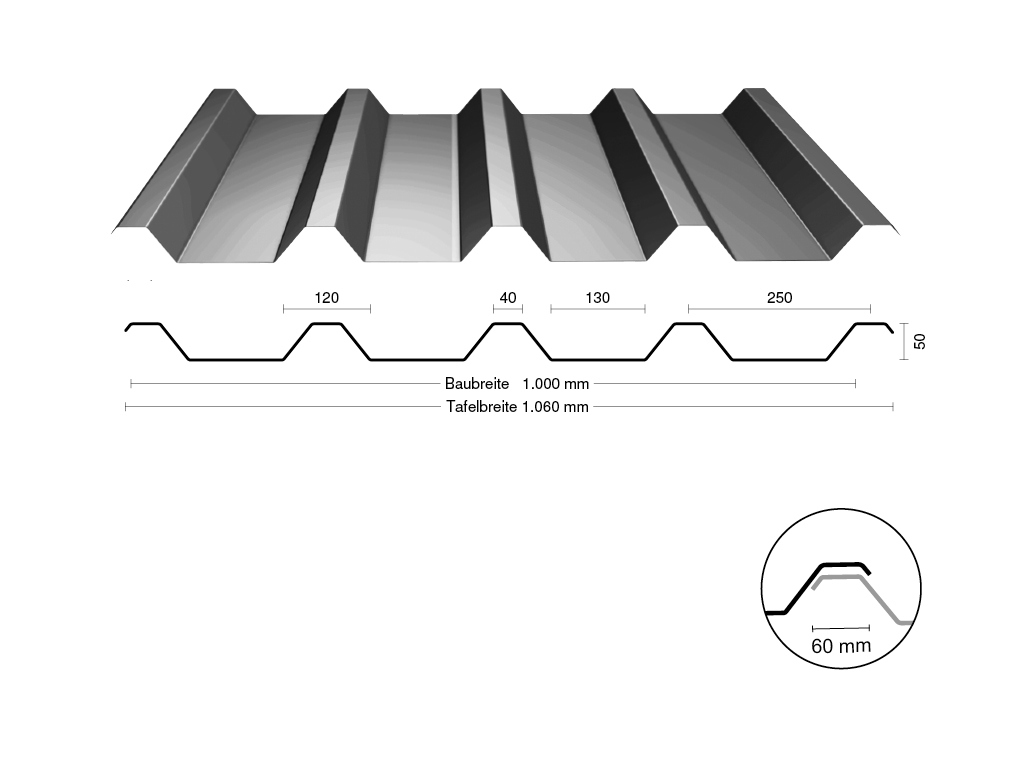 Statisch bietet das Trapezprofil 50-250 gute Werte. Es eignet sich zur Überbrückung größerer Spannweiten an Dach, Wand und Fassade. Das Trapezprofil 50-250 ist sowohl in Positivlage als auch in Negativlage verlegbar. Es ist daher hervorragend als Tragschale für einen Aufbau mit oberseitiger Dachdichtung verwendbar.