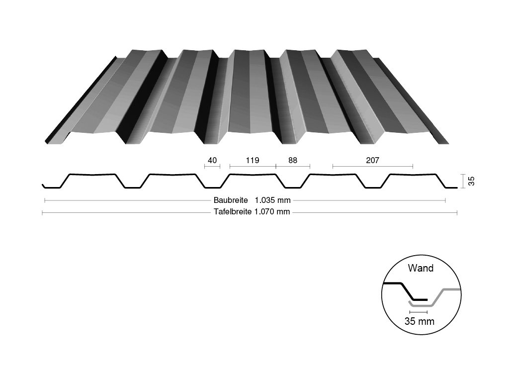 Dank der zusätzlichen Mittelsicke im Obergurt werden eventuelle Spannungsbeulen in der Materialoberfläche vermieden (auf Wunsch auch ohne Mittelsicke erhältlich). Das Trapezprofil 35-207 ist ein sehr beliebtes und bekanntes Profil. Es ist vielseitig in der Anwendung sowie ansprechend und universell in der Optik.