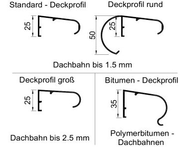 - 2,5 m Deckprofilstäbe für den materialgleichen und spannungsfreien Anschluss der Dachabdichtung