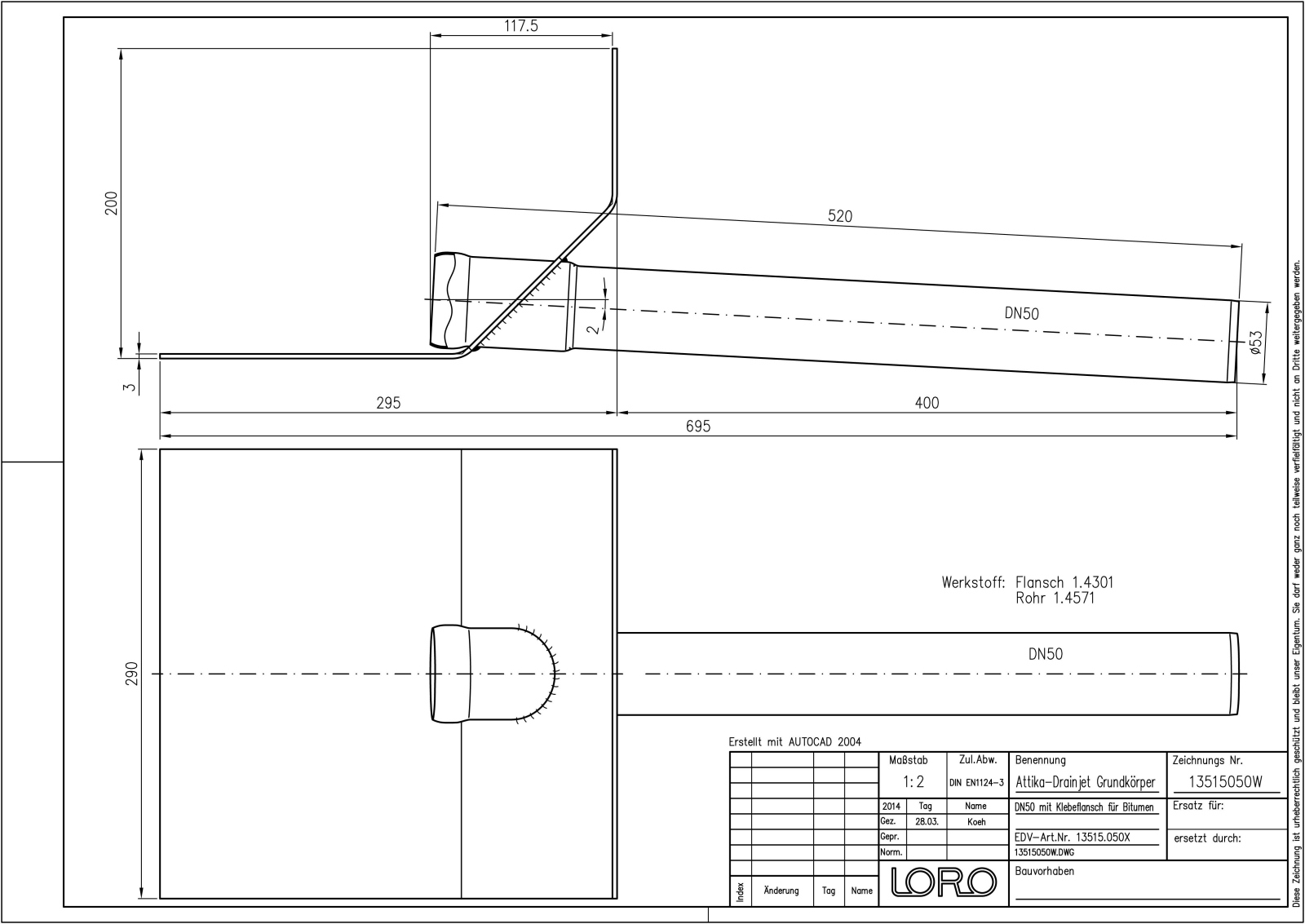 ohne Eingriff ins Dach mit Klebeflansch und 45 Aufkantung für Bitumen-Dachabdichtungsbahnen aus Edelstahl DN 50