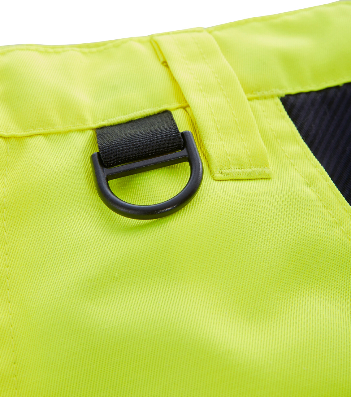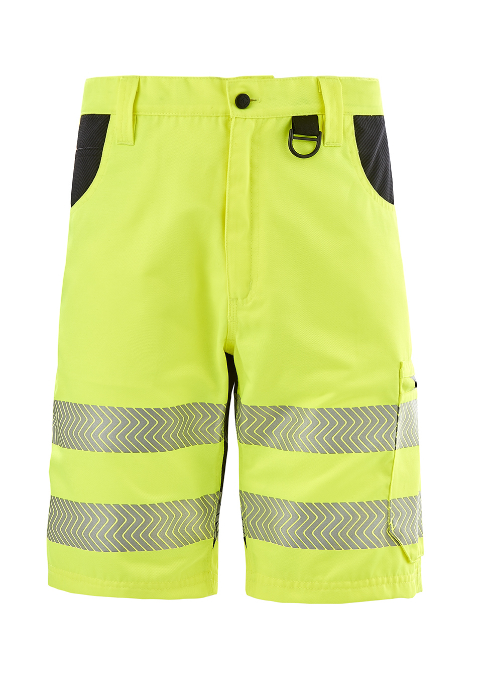 Zertifiziert nach EN ISO 13688:2013 (allgemeine Anforderungen) und EN ISO 20471:2013+A1:2016 (Warnschutz) Klasse 1. Hervorragende Passform dank ergonomischer, körpernaher Schnittform in Verbindung mit Stretcheinsätzen. Das belastbare Twill-Gewebe ist gleichzeitig angenehm weich und geschmeidig. Segmentierte, auflaminierte, 5 cm breite Reflexstreifen, umlaufend um die Hosenbeine der Shorts. Dunkel abgesetzte Besätze am Hosenboden verhindern ein leichtes Anschmutzen. Taschenböden aus abriebfestem Oxford-Gewebe. Eine Cargotasche auf dem linken Hosenbein. 2 Eingriffstaschen vorn, 2 Gesäßtaschen, eine mit und eine ohne Taschenklappe. Zollstocktasche und Hammerschlaufe auf der rechten, hinteren Beinseite. Eine Klettlasche zur Befestigung diverser Tools und D-Ring am Taillenbund sowie eine verstellbare Bundweite.