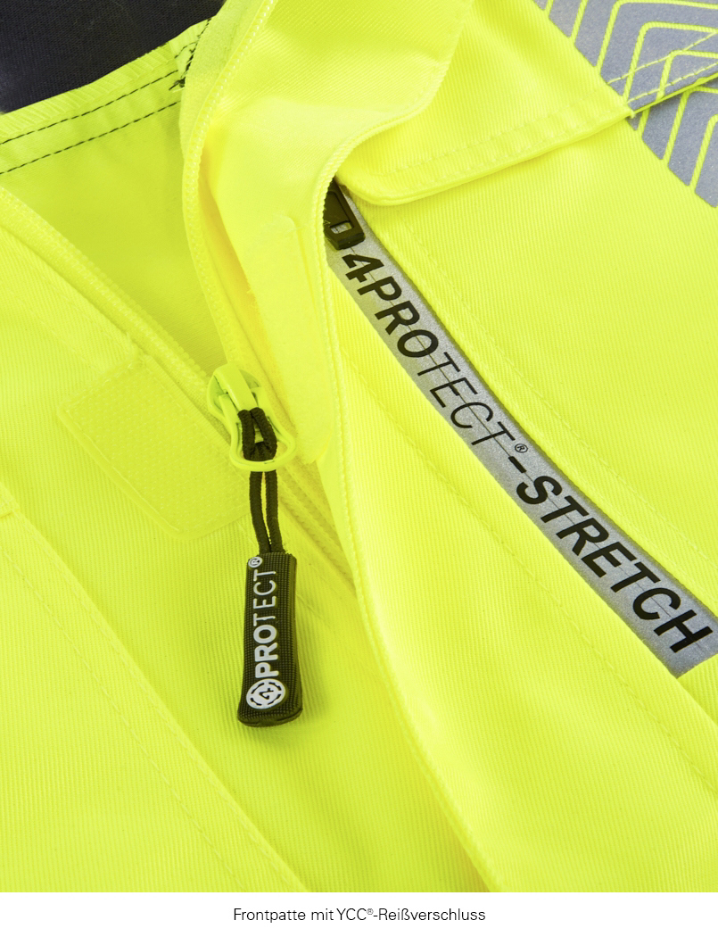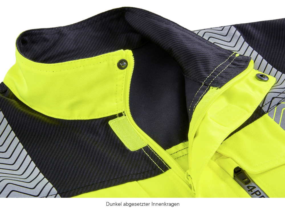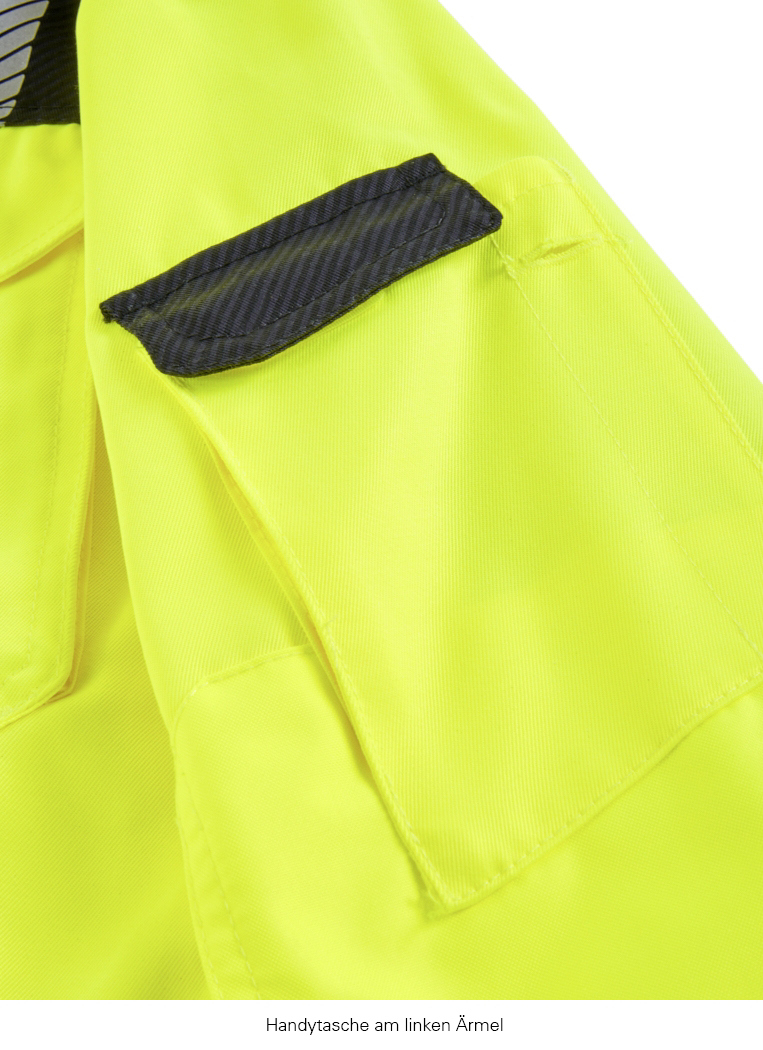 Zertifiziert nach EN ISO 13688:2013 (allgem. Anforderungen), Zertifiziert nach EN ISO 20471:2013+A1:2016 (Warnschutz) Klasse 2. Hervorragende Passform dank ergonomischer, körpernaher Schnittform in Verbindung mit Stretcheinsätzen. Das belastbare Twill-Gewebe ist gleichzeitig angenehm weich und geschmeidig. Segmentierte Reflexstreifen, die direkt auflaminiert werden, umlaufend um Körper und Ärmel sowie über die Schulterpartie (Hosenträgerreflexstreifen). Dunkel abgesetzte Besätze am Saum, den Ärmelmanschetten und im Schulterbereich verhindern leichtes Anschmutzen. Weitere Details: Reflektierende PU-Reißverschlüsse mit Logo-Print, abriebfeste Besätze an Ellenbogen und an den Tascheneingriffen. Große Brusttasche mit vorgesetzter Taschenkombination rechts. D-Ring links. Brustinnentasche und Ärmeltasche für Handy und Stift. Verstellbare Manschetten- und Bundweite. Abgedeckter Front-Reißverschluss mit Druck- und Klettverschluss. Passenabtrennung im Rücken.