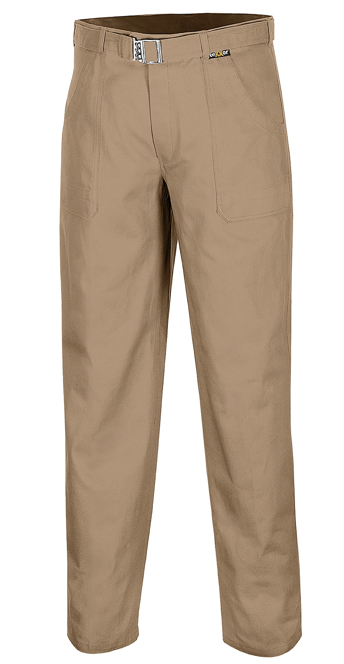 Gürtel mit Verstellschnalle aus rostfreiem Metall. Hosenschlitz mit Knöpfen, 2 Eingrifftaschen mit doppellagigen Taschenbeuteln gegen Verschleiß. 1 Gesäß- und 1 Zollstocktasche. Extra starke Nahtverarbeitung.