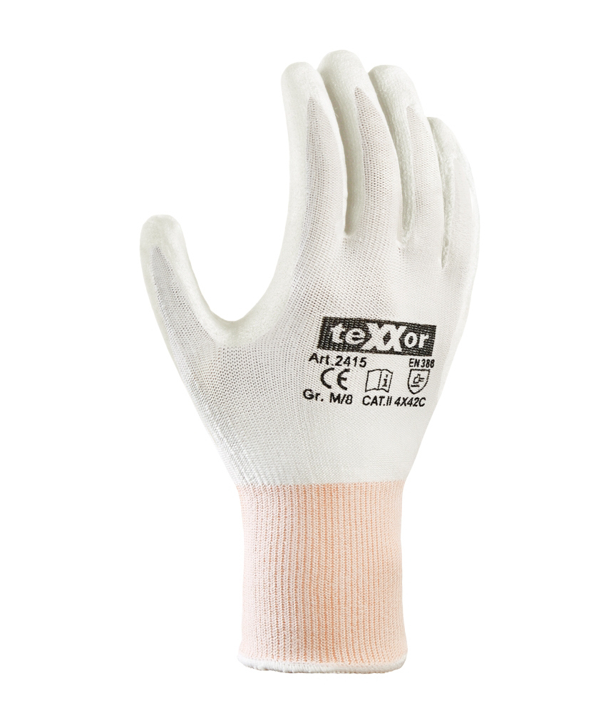Polyethylen/Nylon/Elasthan-Mischgewebe, Polyurethan-Beschichtung auf der Handinnenfläche (weiss), Strickbund, ca. 13 Gauge (= 1,828 mm), Materialstärke: ca. 1,10 mm