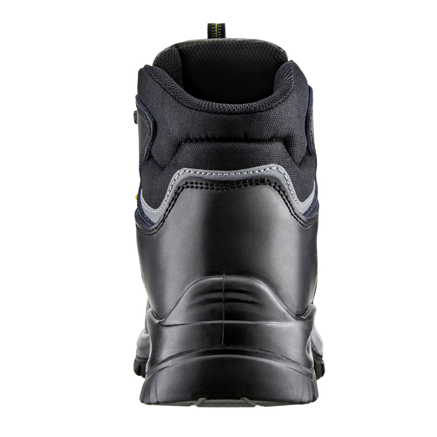 Obermaterial: hydrophobiertes Glattleder, reflektierende Applikationen Futter: atmungsaktives Textil-Funktionsfutter Sohle: 2-Dichten PU/PU-Sohle mit PU-Überkappe Zehenschutzkappe: Stahlkappe Durchtritthemmung: Stahl Fußbett: ganzflächige Einlegesohle