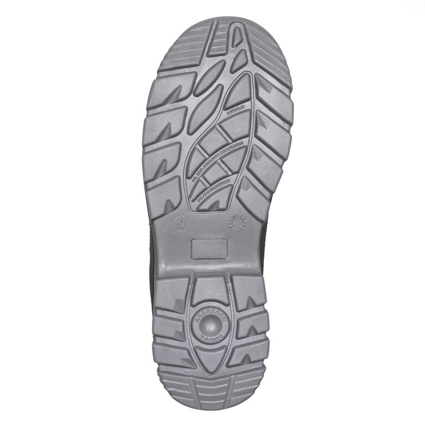 Obermaterial: genarbtes Rindleder Futter: atmungsaktives Textil-Funktionsfutter Sohle: 2-Dichten PU/PU-Sohle mit PU-Überkappe Zehenschutzkappe: metallfreie Composite-Kappe Durchtritthemmung: metallfrei Fußbett: ganzflächige Einlegesohle Plus: metallfrei