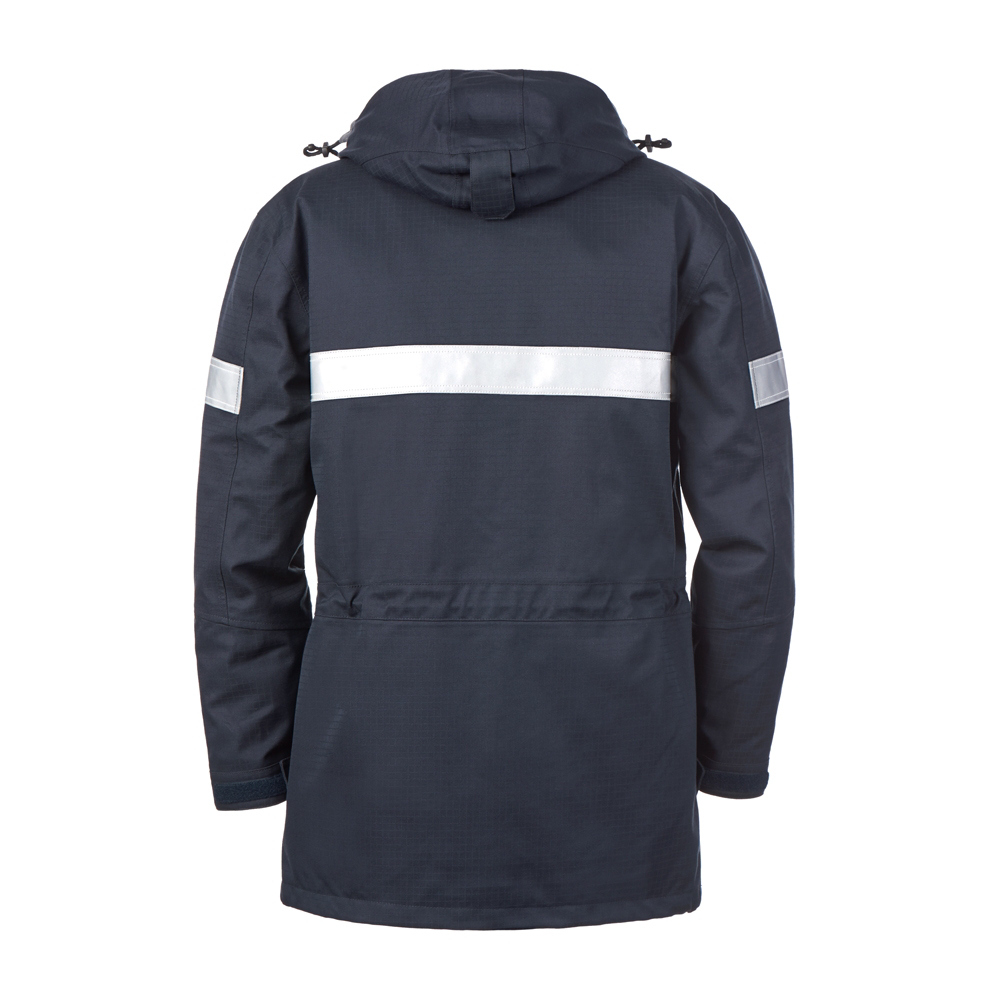 Zertifiziert nach EN ISO 13688:2013, EN ISO 11612:2015, EN ISO 11611:2015, EN 1149-5:2018, EN 13034:2005+A1:2009, EN 343:2019, IEC 61482-2:2018 gemäß IEC 61482-1-2:2014. Wind- und wasserdichte Ausstattung mit einem Wasserdampfdurchgangswiderstand der Klasse 4, was eine lange Tragedauer gestattet. Schwer entflammbare Original 3M Scotchlite™ Reflexstreifen auf Front und Rücken sowie Ärmel. Weitenverstellung in Taille und Saum, vorgeformte Ärmel für eine optimale Passform. Doppelt abgedeckter YKK Front-Reißverschluss, abzippbare Sturmkapuze mit diversen Verstelloptionen. 2 Brusttaschen und 2 großformatige Hüfttaschen sowie 1 Napoleon-Tasche unter der Frontleiste. Im Futter 1 Brust- und 1 große Tasche für die Kapuze. Justierbare Klett-Manschetten. Service-Reißverschluss zum einfachen Bedrucken. Das zertifizierende Institut hat die Bedruckung im maximalen Format 100 x 150 mm (Brust) und 150 x 370 mm (Rücken) für zwei Patchemblem-Produkte unterschiedlicher Anbieter bescheinigt). Weitere Informationen dazu erteilen wir gerne auf Anfrage. Vorbereitet zum Einzippen der Multinorm Fleecejacke: KINGSTON: 3545=navy"
