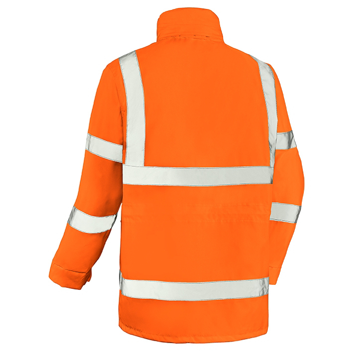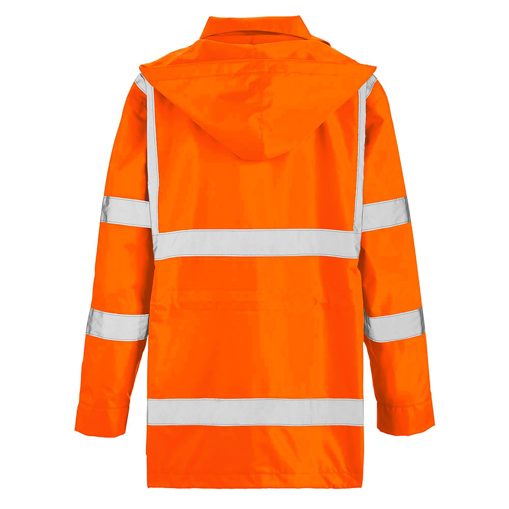 Hochsichtbare, zertifizierte, wasserdichte Warnschutzregenjacke mit umlaufenden Reflexstreifen. Die Jacke entspricht der Warnschutzklasse 3. Mit zertifizierter Freifläche für Logos. Bitte beachten Sie die Vorgaben des Herstellers.