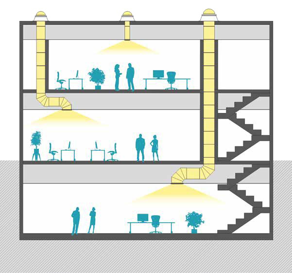 lightube® ist ein Tageslichtspot (Lichttunnel), der sich für diverse Gebäudetypologien einsetzen lässt und mittels Streulinsen Tageslicht in tiefer liegende Räume transportiert.