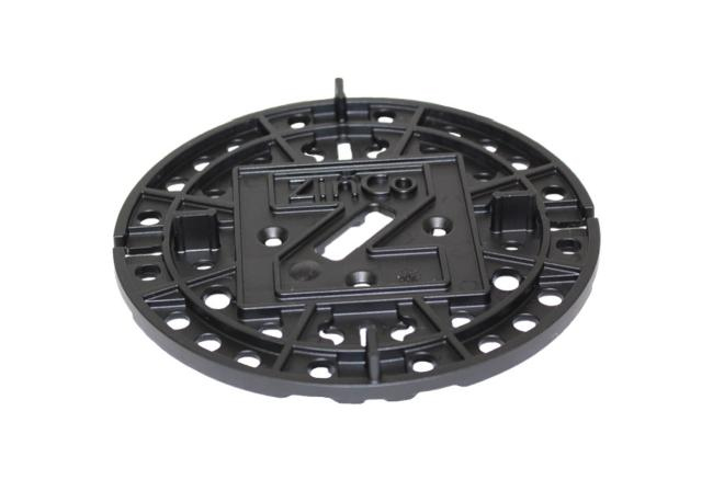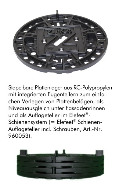 Stapelbare Plattenlager aus RC-Polypropylen mit integrierten Fugenteilern zum einfachen Verlegen von Plattenbelägen, als Niveauausgleich unter Fassadenrinnen und als Auflageteller im Elefeet®Schienensystem (= Elefeet® Schienen Auflageteller incl. Schrauben, Art.-Nr. 960053).