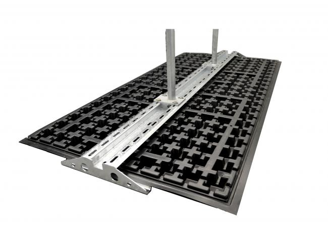 Konstruktionsbasis für durchdringungsfreie Fluchtweg-Abgrenzungen aus profiliertem ABS-Kunststoff mit unterseitigen Aussteifungsprofilen aus Aluminium und einer durchgehenden, vorgelochten Pfostenaufnahme aus Stahl, feuerverzinkt nach DASt-Richtlinie 022, zur Montage von zwei gegenüber liegenden Pfosten mit Schraubflansch.