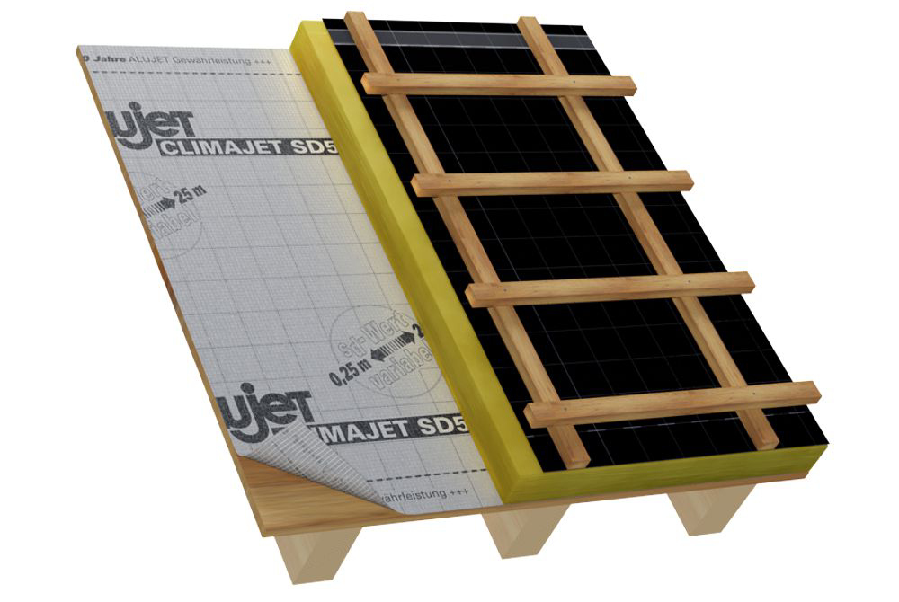 Die ALUJET Climajet SD5 ist eine multifunktionale Dampfbremse für 3 Einsatzbereiche, wie der Einsatz von innen, von außen für Sanierung und der Einsatz unter Aufdachdämmung. Die Austrocknung eingeschlossener Feuchtigkeit und der Feuchtigkeitsabbau kann auch zur Rauminnenseite abgebaut werden. Dachkonstruktionen ohne chemische Holzschutzmittel (DIN 68800) werden mit der ALUJET Climajet SD5 unterstützt.