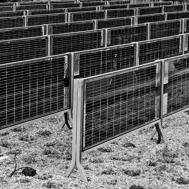 Solar-Aufständerung aus Magnelis®*, abgestimmt auf die ZinCo Solarbasis® SB 200, für die senkrechte Montage von – vorzugsweise bifacialen – PV-Modulen.
