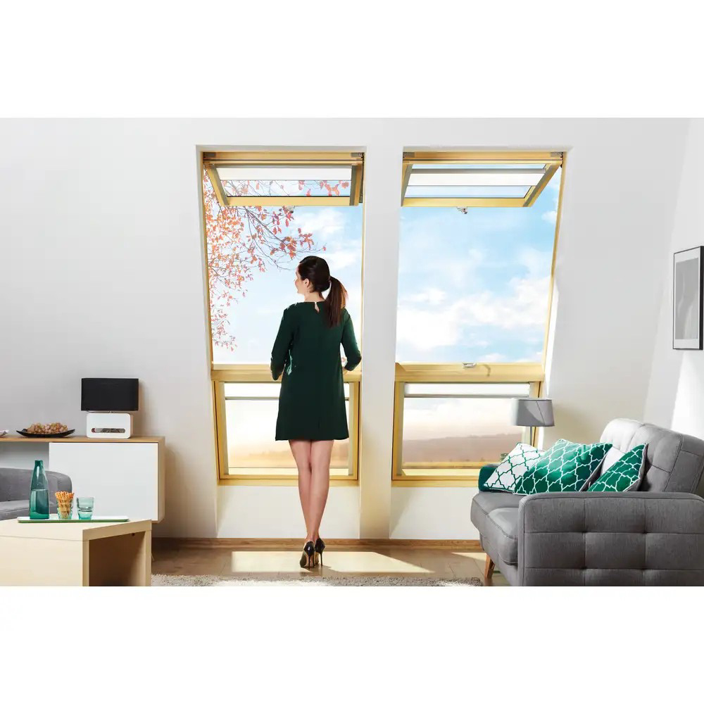 Klapp-Schwing-Fenster überzeugen durch ihre moderne, funktionelle Konstruktion und einfache Bedienung. Sie verfügen über zwei getrennte (voneinander unabhängige) Flügelöffnungsfunktionen: die Schwing- und die Klappfunktion. Durch die Klappfunktion lässt sich der Flügel in einem Öffnungswinkel zwischen 0°–45° Grad beliebig arretieren. Mit der Schwingfunktion kann der Flügel um bis zu 180 ° Grad geschwenkt werden. Neuartige Beschläge garantieren die volle Stabilität des Flügels sowohl in der Schwing- als auch in der Klappfunktion. Die Umstellung von der Schwing- auf die Klappfunktion (und umgekehrt) erfolgt bequem mit dem am Blendrahmen befindlichen, nach dem Öffnen des Fensters sichtbaren, preSelect-Schalter. Die Klapp-Schwing-Fenster sind mit der automatischen Dauerlüftung V40P ausgestattet, die für einen effektiven Zustrom von frischer Luft sorgt. Die Dauerlüftung V40P sichert ein gesundes Mikroklima im Dachgeschoss.