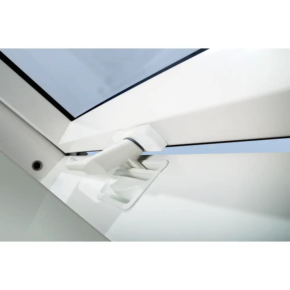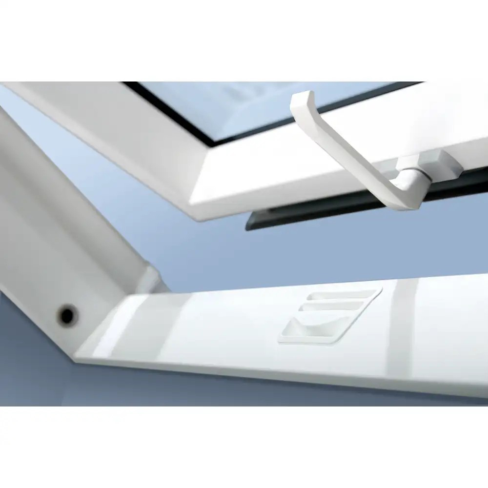Das Kunststoff-Schwingfenster besteht aus weißen, innen mit verzinktem Stahlkern verstärkten Kunststoffprofilen. Diese sind auf Basis eines ökologischen Stabilisators aus einer Kalk-Zink-Mischung in weiß (RAL 9010) gefertigt. Die Kunststofffenster sind in erster Linie für Feuchträume geeignet, aber auch für Kunden, die moderne, weiße und pflegeleichte Dachfenster bevorzugen. Das Fenster ist gegen Rost und Witterungseinwirkungen beständig und bedarf wenig Pflege. Der Profilkunststoff weist eine hohe Beständigkeit gegen Feuchtigkeit und sonstige äußerliche, im Dachfensterbereich auftretende Einwirkungen auf.