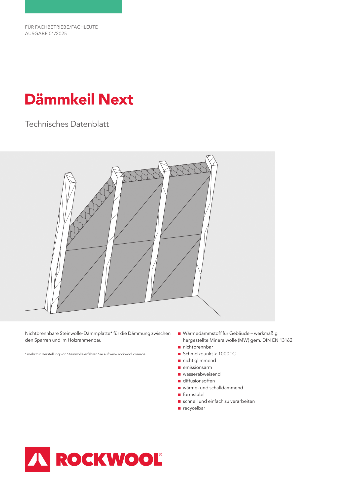 Der Dämmkeil Next ist eine Dämmplatte für die Zwischensparrendämmung sowie den Holzrahmenbau, die sowohl Wärme-, Schall- als auch Brandschutzanforderungen erfüllt.