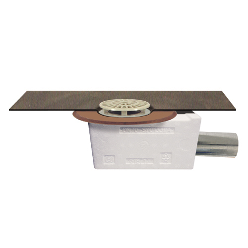 LORO-Balkonabläufe mit Anschlussmanschette nach DIN EN 1253, aus Stahl, feuerverzinkt mit zusätzlicher Beschichtung, Farbton: Rotbraun, alternativ: aus Kupfer massiv, Auslauf senkrecht/Auslauf seitlich ohne/mit Wärmedämmung