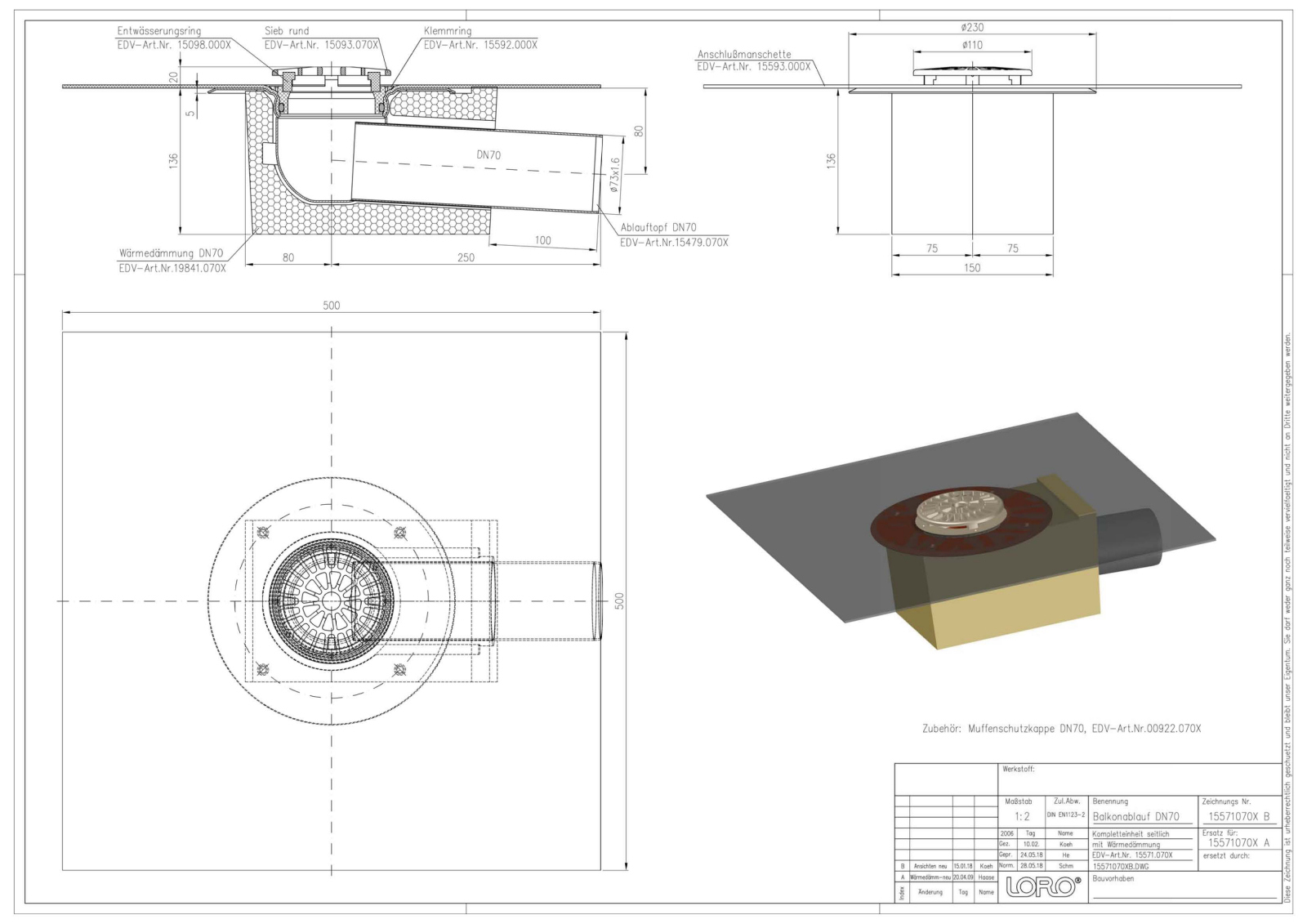 LORO-X Balkonablauf, Serie E, einteilig mit Wärmedämmung, Auslauf seitlich 3 Grad, mit vormontierter Anschlussmanschette aus Bitumen EPDM Verbund, nach DIN EN 1253 mit erhöhtem Qualitätsstandard gemäß RAL-Gütezeichen GZ-694, aus Stahl feuerverzinkt, mit langlebiger Beschichtung gemäß DIN EN ISO 2178 auf Basis einer 2K-Epoxid-Kombination, Farbton: Rotbraun, bestehend aus Ablauftopf, Anschlussmanschette, Klemmring, Entwässerungsring, Sieb rund, DN 70