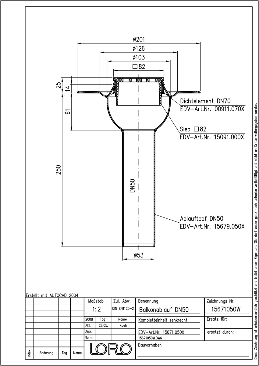 LORO-X Balkonablauf, Serie A mit Stützrand, einteilig ohne Wärmedämmung, Auslauf senkrecht, nach DIN EN 1253 mit erhöhtem Qualitätsstandard gemäß RAL-Gütezeichen GZ-694, aus Stahl feuerverzinkt, mit langlebiger Beschichtung gemäß DIN EN ISO 2178 auf Basis einer 2K-Epoxid-Kombination, Farbton: Rotbraun, bestehend aus: bestehend aus Ablauftopf (Stützrandbreite 35 mm umlaufend), Dichtelement, Kunststoffsieb 82 x 82 mm (für Aufbauhöhe ca. 30 +/- 5 mm), DN 50