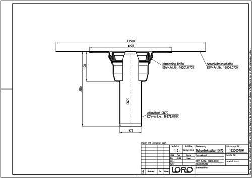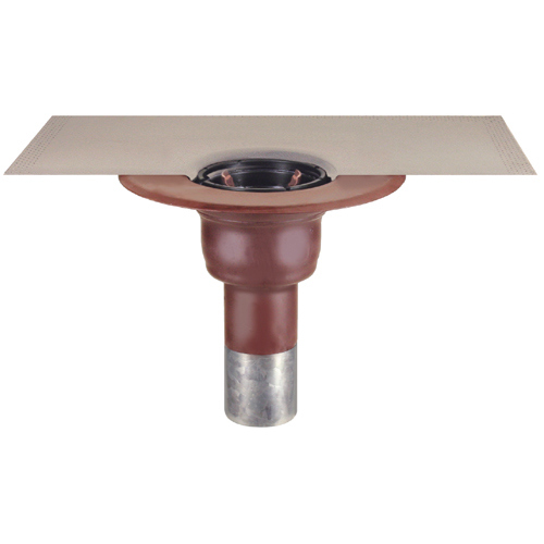 LORO-Balkondirektablauf-Grundeinheit, mit VS-Anschlussmanschette Mehrlagen-Verbundwerkstoff, Serie HF, aus Stahl, feuerverzinkt, langlebige Innenbeschichtung gemäß DIN EN ISO 2178 auf Basis einer 2K-Epoxid-Kombination, Farbton: Rotbraun, Fallrohrlänge 250 mm, ohne Wärmedämmung, bestehend aus Ablauftopf, VS-Anschlussmanschette, Klemmring, DN 70