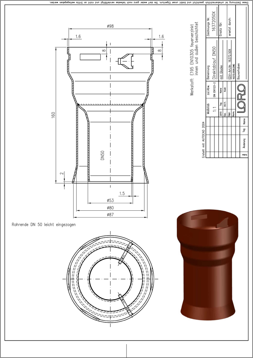 LORO-X Balkondirektablauf, Serie I mit Glocke, Auslauf senkrecht, nach DIN EN 1253 mit erhöhtem Qualitätsstandard gemäß RAL-Gütezeichen GZ-694, aus Stahl feuerverzinkt, mit langlebiger Beschichtung gemäß DIN EN ISO 2178 auf Basis einer 2K-Epoxid-Kombination, Farbton: Rotbraun, für Plattenstärke 160 mm, ohne Sieb, DN 50