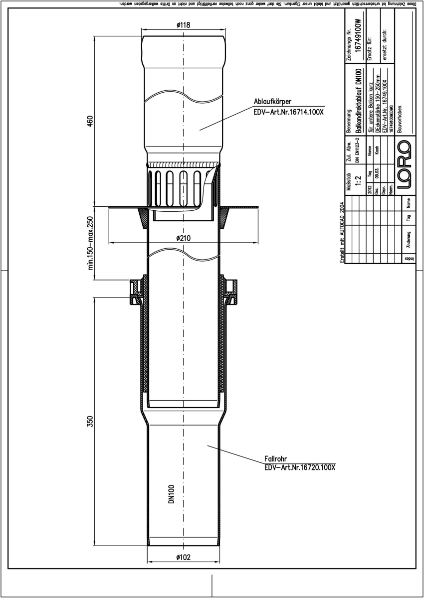 LORO-X VERSAL Balkondirektablauf, Serie J mit Stützrand, einteilig ohne Wärmedämmung, Auslauf senkrecht, nach DIN EN 1253 mit erhöhtem Qualitätsstandard gemäß RAL-Gütezeichen GZ-694, aus Stahl feuerverzinkt, mit langlebiger Beschichtung gemäß DIN EN ISO 2178 auf Basis einer 2K-Epoxid-Kombination, Farbton: Rotbraun, bestehend aus Ablaufkörper mit Langmuffe, Anschlussgewinde und konischer Dichtung, Fallrohrlänge 350 mm, für Deckenstärke 150 - 250 mm, für untere Balkone, DN 100
