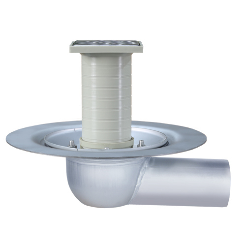 LORO-X VERSAL Balkonablauf, Serie K, einteilig ohne Wärmedämmung, Auslauf seitlich 3 Grad, mit Klemmflansch, nach DIN EN 1253 mit erhöhtem Qualitätsstandard gemäß RAL-Gütezeichen GZ-694, aus Edelstahl, bestehend aus Ablauftopf, Flanschdichtring, Losflansch, Entwässerungsring, Siebaufnahme 100 x 100 mm (für Aufbauhöhe 10 - 130 mm), Edelstahlsieb, DN 70