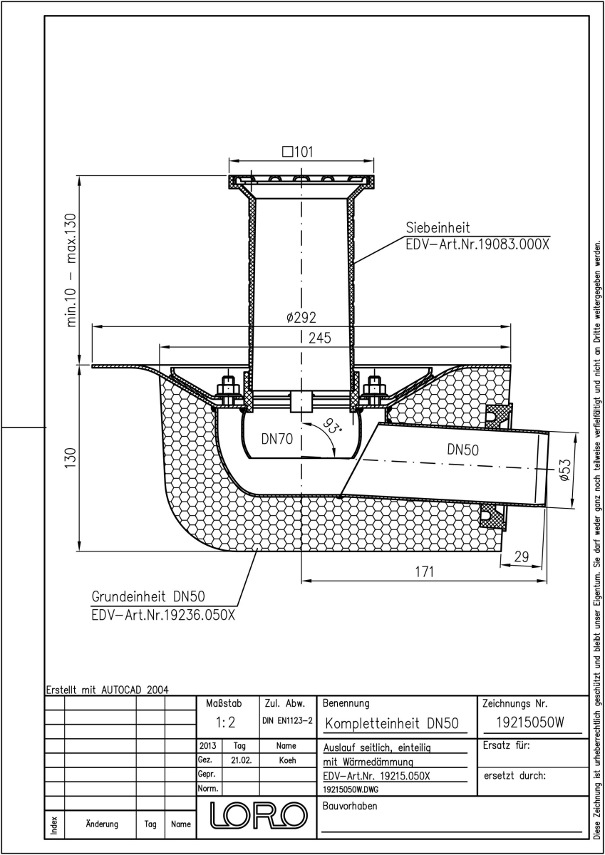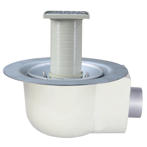 LORO-X VERSAL Balkonablauf, Serie K, einteilig mit Wärmedämmung, Auslauf seitlich 3 Grad, mit Klemmflansch, nach DIN EN 1253 mit erhöhtem Qualitätsstandard gemäß RAL-Gütezeichen GZ-694, aus Edelstahl, bestehend aus Ablauftopf, Flanschdichtring, Losflansch, Entwässerungsring, Siebaufnahme 100 x 100 mm (für Aufbauhöhe 10 - 130 mm), Edelstahlsieb, DN 50
