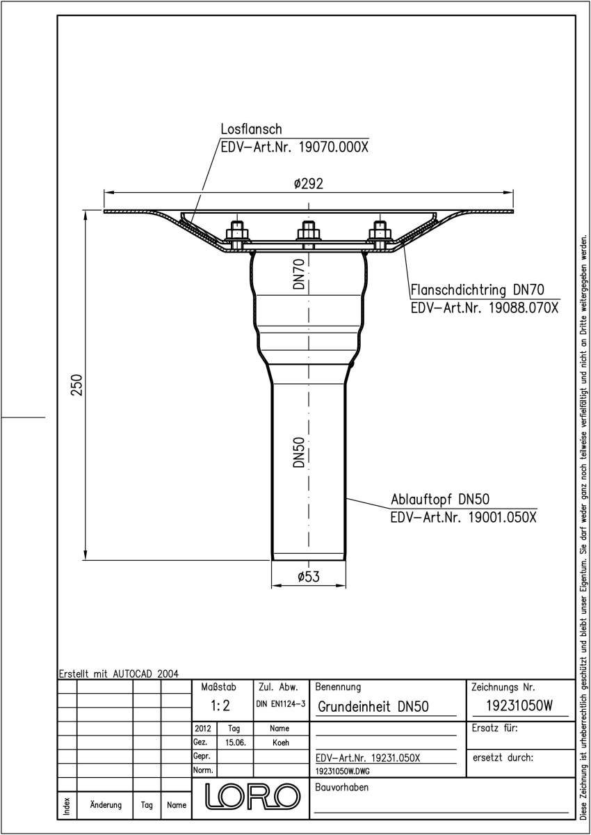 LORO-VERSAL Balkonablauf-Grundeinheit mit Klemmflansch, Serie K, nach DIN EN 1253 mit erhöhtem Qualitätsstandard gemäß RAL-Gütezeichen, aus Edelstahl, Auslauf senkrecht, ohne Wärmedämmung, bestehend aus Ablauftopf, Flanschdichtring, Losflansch, DN 50