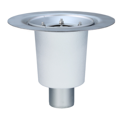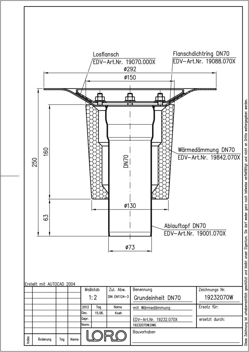 LORO-VERSAL Balkonablauf-Grundeinheit mit Klemmflansch, Serie K, nach DIN EN 1253 mit erhöhtem Qualitätsstandard gemäß RAL-Gütezeichen, aus Stahl, feuerverzinkt , langlebige Innenbeschichtung gemäß DIN EN ISO 2178 auf Basis einer 2K-Epoxid-Kombination, Farbton: Rotbraun, Auslauf senkrecht, mit Wärmedämmung, bestehend aus Ablauftopf, Flanschdichtring, Losflansch, DN 70