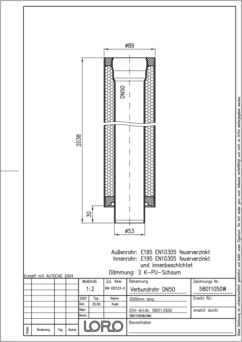 LORO-X Verbundrohr bestehend aus Innenrohr (LORO-X Rohr, aus Stahl feuerverzinkt, nach DIN EN 1123, mit erhöhtem Qualitätsstandard gemäß RAL-Gütezeichen GZ-694, mit 2-Kammern-Steckmuffenverbindung, Baustoffklasse A1, formstabil, bruchfest, rückstausicher, langlebige Innenbeschichtung gemäß DIN EN ISO 2178 auf Basis einer 2K-Epoxid-Kombination, Farbton: Rotbraun), Dämmschicht (PU-Hartschaum B2, FCKW-frei) und Außenrohr (LORO-X Rohr, aus Stahl, feuerverzinkt), 2000 mm lang, DN 50