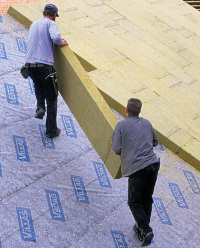 Wärme-, Schall- und Brandschutz von Schrägdächern oberhalb der Sparren. Die Aufsparrendämmung Masterrock GF ermöglicht eine durchgehende und damit wärmebrückenfreie Verlegung des Dämmstoffs.