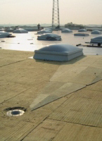 Zur Ausbildung einer Punktentwässerung wird durch den Einsatz der Kehlgefälleplatten in der horizontalen Kehle ein neues Gefälle hergestellt und somit das Wasser abgeleitet.