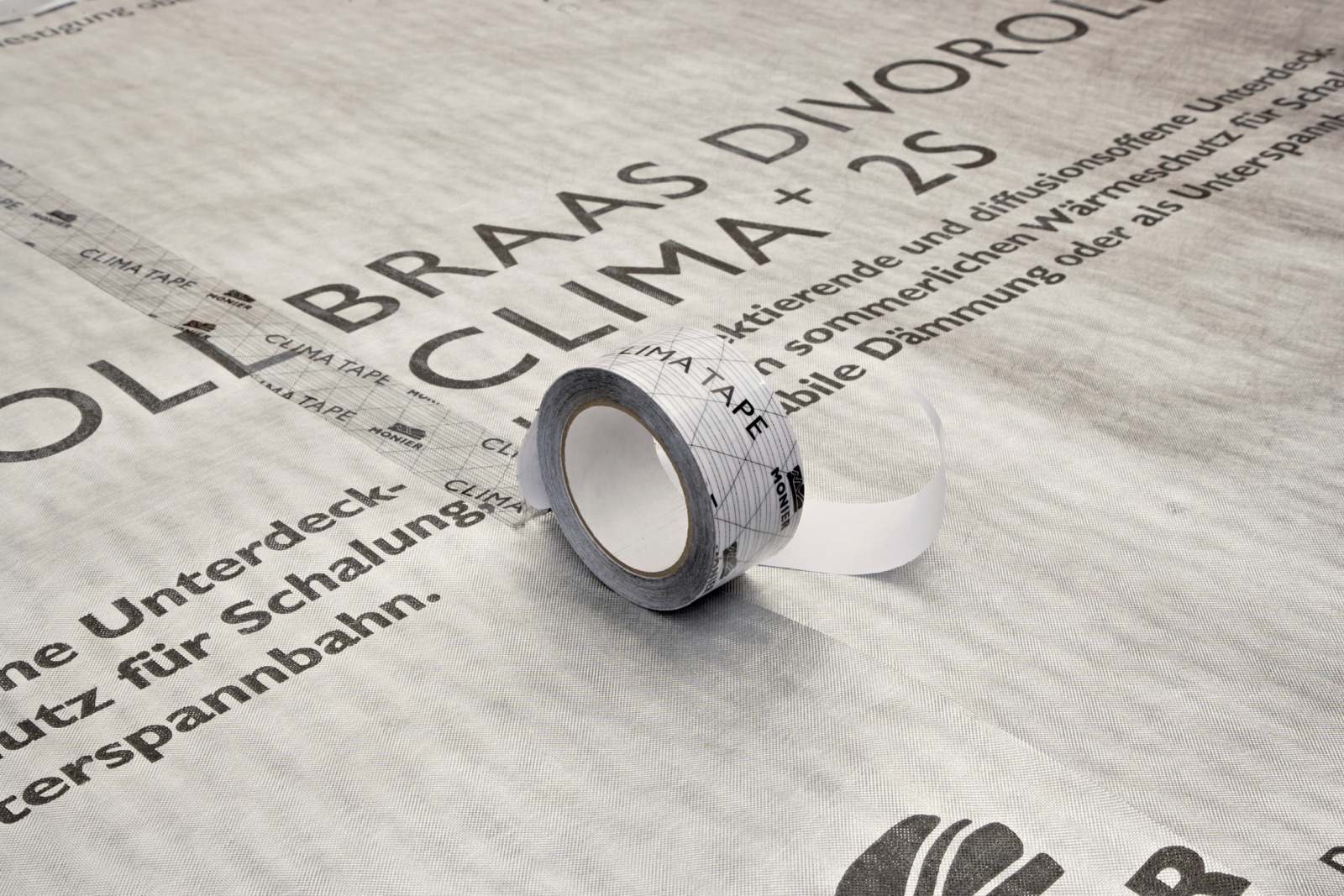 Das einseitige Dach-Klebeband Divoroll Clima Tape von Braas hilft beim Verkleben von Überlappungen, Anschlüssen und Rissen bei der Divoroll Unterdeckbahn.