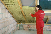 komprimierte Rolle öffnen, Platten mit Übermaß abschneiden und schnell und sicher zwischen die Sparren einbauen.